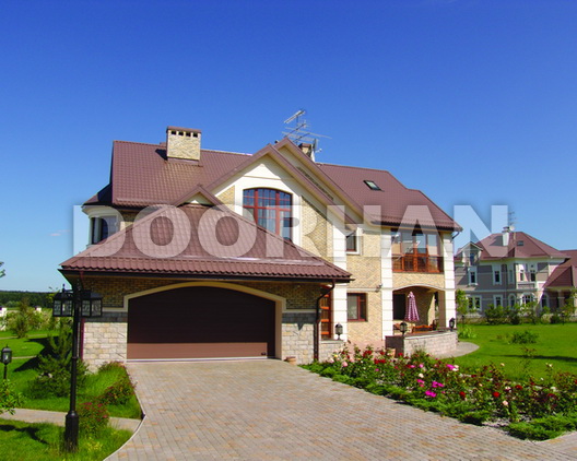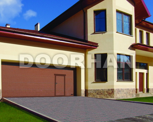 Ворота Yett 02-30S изготавливаются в наиболее популярном цветовом исполнении – из сэндвич-панелей «Горизонтальная полоса» с поверхностью «stucco» белого (RAL 9003) и коричневого (RAL 8014) цветов.