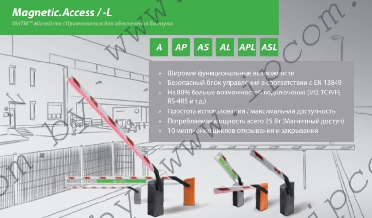 Шлагбаумы Magnetic Access были специально разработаны для использования на объектах с различной интенсивностью использования, от низкой до очень высокой, например, на промышленных объектах, жилых объектах или на небольших стоянках. Кроме того, могут быть эффективно и надежно обустроены подъездные пути с проезжей частью шириной до 6 м. Модельный ряд Magnetic Access предлагает не только длительный срок службы, высокую надежность и качество, но также производит впечатление крайне низкими эксплуатационными расходами, простотой использования и тем, что почти не требуется обслуживание.