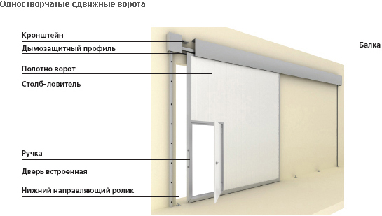 В полотно ворот может быть установлена противопожарная дверь, которая оснащена петлей с пружинным доводчиком. Она имеет те же свойства, отвечает тем же требованиям и окрашивается в тот же цвет, что и противопожарные ворота (стандартный размер двери – 990х2050 мм, порога – 115 мм).