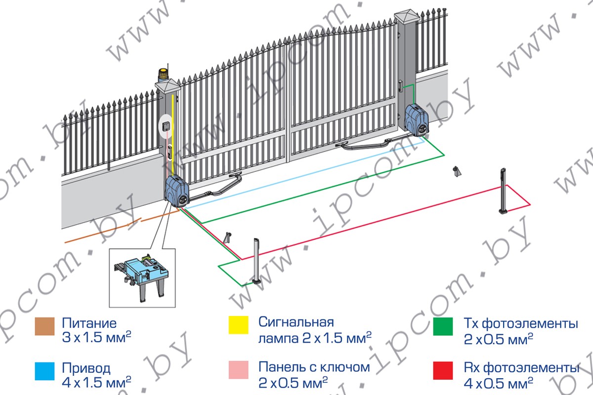 Для автоматизации распашных ворот со сложным расположением створок используются универсальные приводы рычажного типа Compas. Рычажные приводы представляют собой электромотор с редуктором, закрепляемый на неподвижной части конструкции ворот (например, колонне), и рычаг, крепящийся к створке ворот.