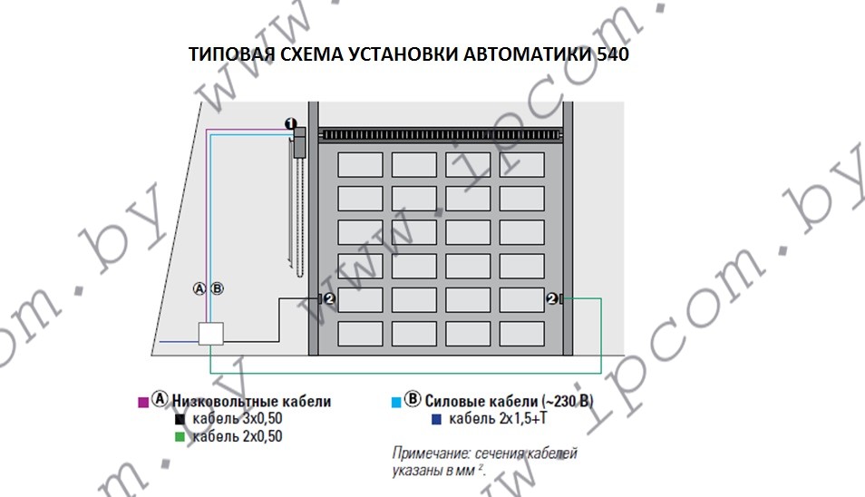 Комплектация 540 (540 BPR): привод с концевыми выключателями и встроенной платой управления 200 BT (540 BPR), монтажная пластина, система тросовой разблокировки привода.